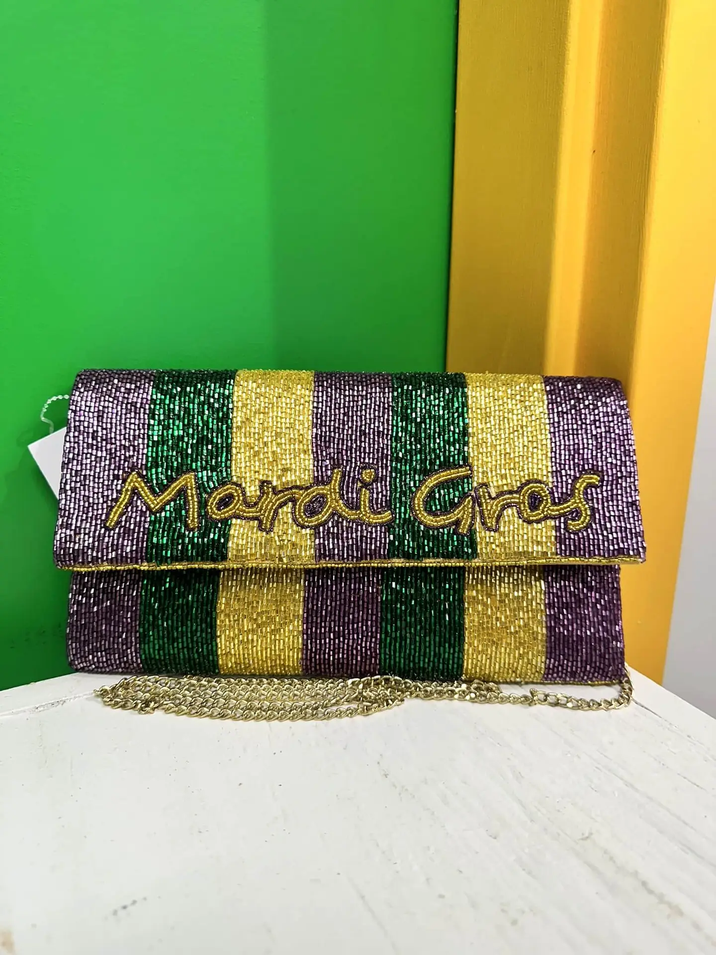 Celebrate Mardi Gras in style with this striped beaded purse featuring classic carnival colors and a chain strap. Perfect for parades, balls, and Mardi Gras events in Lafayette, it’s a fun and festive accessory that stands out while keeping essentials close.